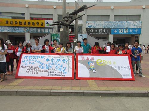 5月7日中午,经济管理学院在二餐门口举行了第五届“e路争先“电子商务大赛的宣传活动。此次大赛由经济管理学院科技创新部和社团部联合承办,两部全体成员到场参加了此次宣传活动并取得了良好的活动反响。