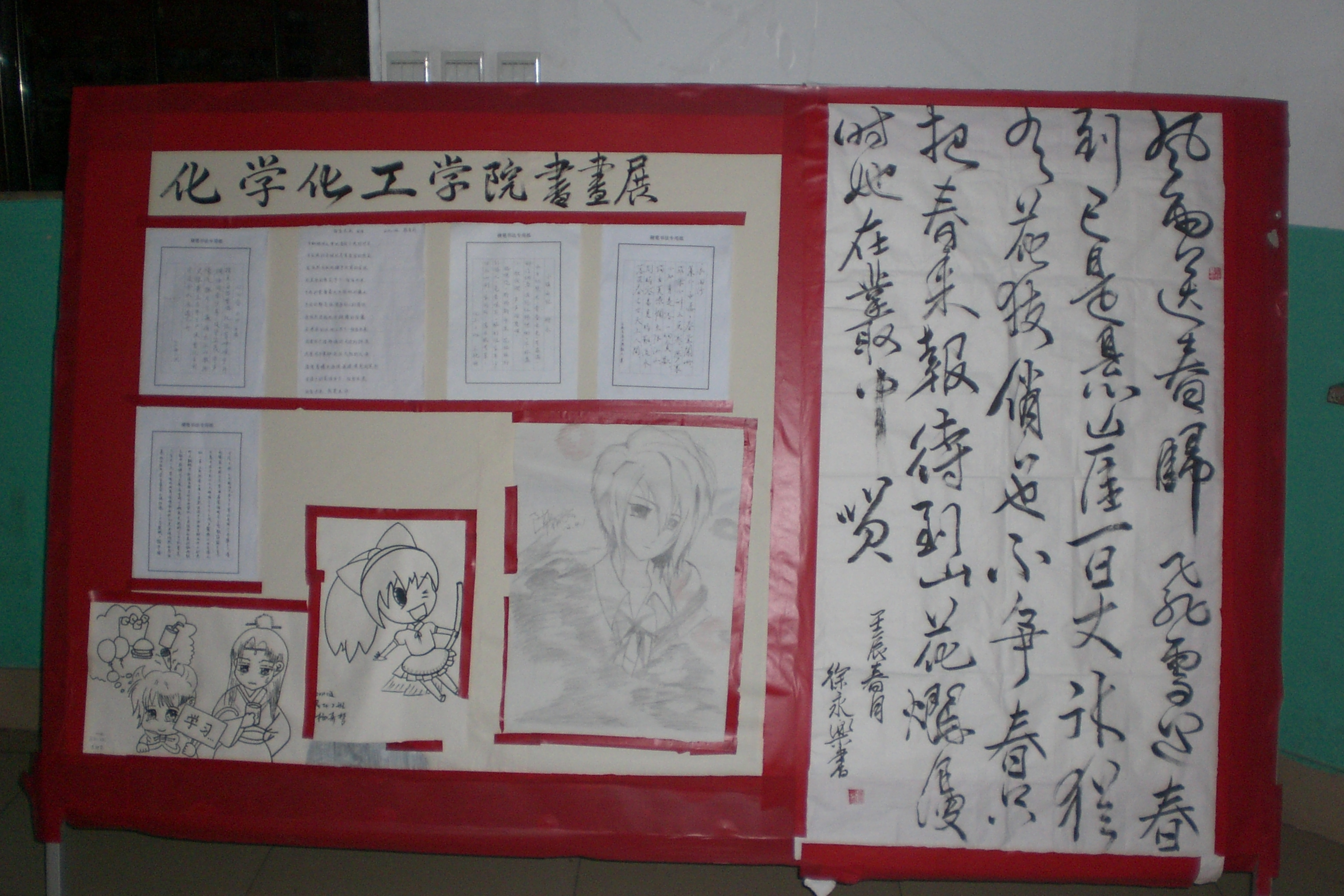 为丰富同学们的课余文化生活,近日,由化学化工与环境工程学院团总支主办,我院学生会宣传部承办的书画展在人合楼8212展出。