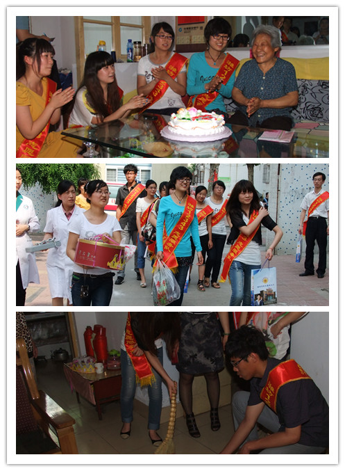 社区阿姨热心地向我们介绍了社区对空巢老人们关怀,他们邀请了医护人员免费为老人们健康查体,进行义诊活动。之后带领我们的志愿者服务同学以及12343服务人员为老人们送去了节日的蛋糕、新鲜蔬菜及生活用品。志愿者同学主动帮助老人打扫卫生,与她们交谈聊天,并演唱了《母亲》歌曲等,陪她们度过了愉快而温馨的母亲节。一句问候,一片心意,让社区的母亲们感受到一份特别的温暖与关怀。