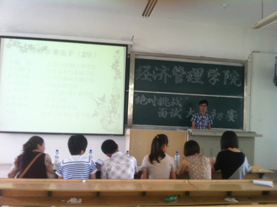 由团委主办,经济管理学院团总支、学生会承办的第六届“绝对挑战”面试大赛于5月10日在致远楼6#401教室进行了初赛的选拔。经济管理学院团总支、学生会的部分成员担任初赛的评委,各系参赛选手到场参加了比赛。