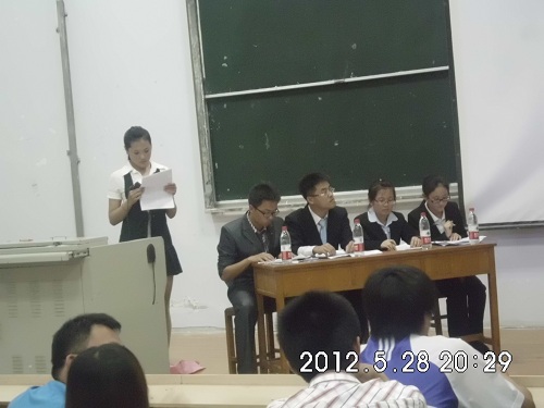 辩论赛分两个小组进行,外国语对阵经管,体育对阵机电。辩论赛中,辩手们利用自己所掌握的相关资料及个人的切身经历,进行了精彩而激烈的辩论。辩手们敏捷的反应和慷慨激昂的辩驳赢得了观众们的阵阵掌声。值得一提的是,外院的四名女辩手在对抗经管的二男二女对手时,毫不逊色。在自由辩论阶段中,外院辩手的出色表现,更是引起观众们的阵阵欢呼。