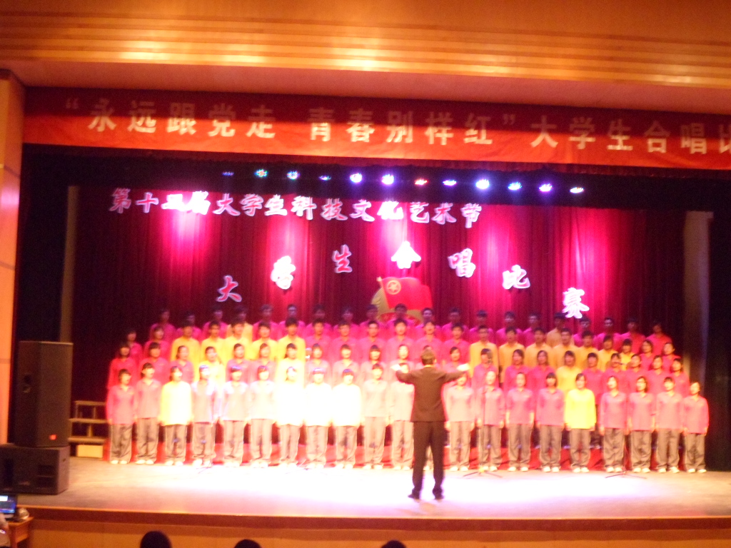 决赛当天,闻韶楼排练厅灯光璀璨、光彩夺目,观众席上早已座无虚席。化学化工与环境工程学院作为第七支队伍出场,饱满的精神面貌、嘹亮的歌声给现场师生带来了焕然一新的感觉。整齐划一的服装,远观组成的“九十”二字,一曲铿锵有力地《共青团员之歌》,一曲温婉而转的《在太行山上》表达出了化学化工与环境工程学院广大团员青年对建团90周年的礼赞,唱出了团员青年青春的梦想,赢得了在场观众的阵阵掌声。。