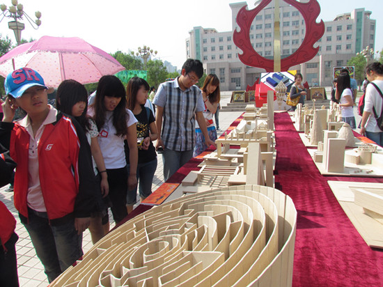 此次参展作品均为学生作品,主要分为绘画作品,室外景观模型,雕塑等。一件件作品在明媚的阳光下,闪着别样的光,来往的行人纷纷驻足观看。这边,有同学为室外景观模型赞叹不已,那边,有同学为作品的奇思妙想感叹。