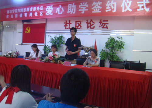5月11日,潍坊学院外国语学院白鸽志愿者服务队与东关街道苇湾社区爱心助学活动正式签约。一同前往的白鸽志愿者服务队、居委会人员、部分家长与学生、齐鲁晚报记者共同见证了这个神圣的时刻。