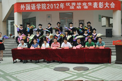 四月里外国语学院学子用青春歌颂梦想,用青春释放激情,在运动场上留下了足迹;转眼间,六月毕业季来临,同学们互道别离、互相珍重,承载了太多太多的不舍与祝福。在这个特殊的日子里,6月14日下午,外国语学院2012年优秀毕业生、运动会表彰大会在至善楼院内隆重举行。出席本次大会的有外国语学院院长王勇,团总支书记李瑞民,副院长王智玲、韩泽亭,各年级辅导员,优秀毕业生、优秀运动员以及11级全体同学。
