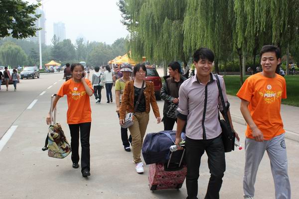 今天不算是烈日炎炎,但体育学院迎新人员热情高涨,为新来报到的学弟学妹提供热情的服务。每当从火车站或者汽车站接新生的车到达接待点的时候,拿着体育学院牌子的同学都会高举着系牌。将新生有序地带领到接待点,然后由志愿者们带领着新生办理各项手续,并协助他们入住新宿舍。虽然大家都比较辛苦,但是每个人都用最热情的服务、最温馨的微笑迎接来自不同地方、不同民族的2012级新生,让他们感受到这个大家庭的温暖。