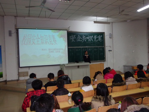 为帮助当代大学生树立安全思想,加强安全防范意识,提高自我管理、自我防范、自我保护的意识。数学与信息科学学院于11月23日晚7:00在8#122举办了有关“校园安全知识”的竞赛。出席本次活动的有,数学学院学生会主席于晓枫,秘书长胡雪慧,副主席张海龙、李银涛、高占、郝春玲,副秘书长张淑洁、王咏梅以及各部部长。