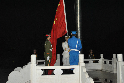 早上六点钟,全体同学已经在行政楼前整齐有序地站好队伍,升旗仪式正式开始。伴随着《中华人民解放军军歌》的响起,国旗护卫队成员抬着神圣的国旗迈着铿锵有力的步伐走带国旗台下,全场肃静。在激昂的《中华人民共和国国歌》中,在全院师生的注目下,鲜艳的五星红旗在风中徐徐展开,飘扬在潍坊学院的上空。随后,预备党员、2010英语二班学生孔颜发表国旗下演讲。他提到即将召开的十八大中国发展意义重大,青年学生尤其是学生党员应该积极响应国家的号召,牢记告诫,践行承诺,成就行为。接下来,2012级学生代表、法语二班王煜发表了国旗下演讲,她认为大学生生活里最重要的一点就是要有自己的理想,倡议同学们树立远大的理想,为祖国建设贡献自己的力量。