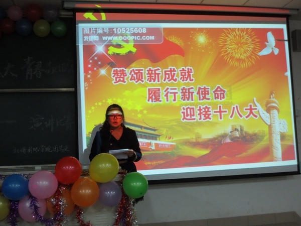 2012年11月4日晚,北海国际学院在7507教室举行以“喜迎十八大,青春献给党”为主题的演讲比赛。参加此次比赛的是北海国际学院2012级的新同学,在党的十八大即将召开之际,同学们结合对党的认识,抒发北海国际学院新生立志成才、报效党、报效祖国的自信心和责任感。