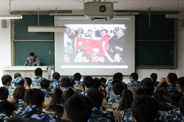 在整个阅兵式播放过程中,学生们看得十分认真,并不时爆发出热烈的掌声。看着大屏幕里人民解放军、武装警察部队和民兵预备役部队8000余名官兵组成的受阅方阵,以坚定豪迈的步伐、排山倒海的气势、巨龙临空的雄姿,展示了我军捍卫国家安全与发展利益、维护世界和平的强大力量。同学们都既兴奋又骄傲,他们说:“这场面气壮山河!振奋人心!我为祖国强盛而自豪!我为自己是‘炎黄子孙’而感到自豪!”此外教官还列举了许多军事实例,各位同学也都很感兴趣,听得非常投入。