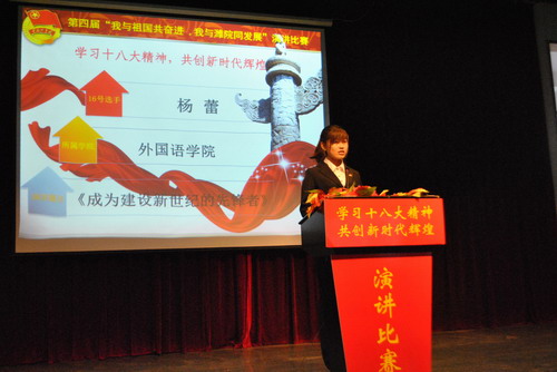 为进一步学习宣传贯彻党的十八大精神,把广大团员青年的思想和行动统一到党的十八大精神上来,12月7日,潍坊学院在闻韶楼报告厅举办了第四届“我与祖国共奋进,我与潍院同发展”之“学习十八大精神,共创新时代辉煌”大学生演讲比赛决赛。经过层层选拔,最终18名优秀选手晋级决赛。