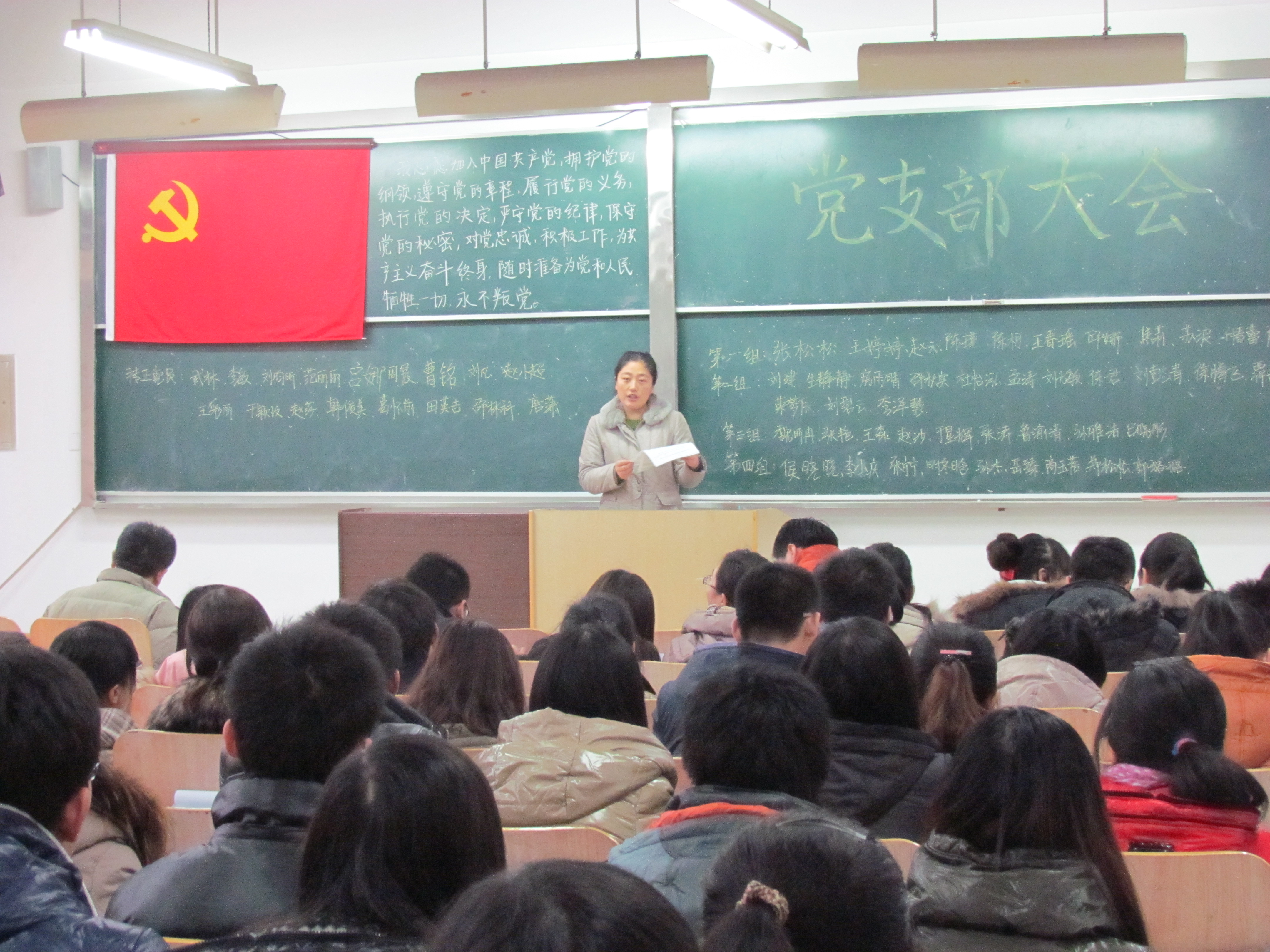 此次大会主要有两部分组成。首先进行的部分是党员发展大会,而这一部分又由申请入党人员介绍、第一次申请的同学的介绍人介绍、大会表决、本次申请的党员表决心四方面组成。在申请入党人介绍中申请入党的同学依次发表了慷慨激昂的演讲。他们用饱满的激情向党表达了他们对党的热爱与拥护。这一小节结束后副辅办主任、团总支书记徐会全老师、副主席张绪玉同学对申请入党的同学进行了客观公正的介绍,介绍完毕后由出席的21位正式党员进行表决,最后在申请党员的同学们坚定地决心宣言中党员发展大会部分结束。紧接着进行大会第二部分预备党员转正大会。在这一部分中首先进行的是预备党员对自己这一年的情况汇报。随后由老师对预备党员们的表现发展提相关建议,他们都表示受益匪浅会一定落实到今后的学习工作上去。最后在21名正式党员进行表决的同时预备党员转正部分也宣告完成。随后依照惯例所有党员在党旗下进行了庄严的宣誓整个过程显得肃穆而又神圣。在大会的尾声徐会全老师对整个大会做了简短却又精炼的的总结,他用简朴的话语又一次将党的精神传达给了在场的同学,他用严肃的神情再次向在场的同学传达了今后工作的重要性。最后大会伴着徐会全老师演讲的结束圆满完成。