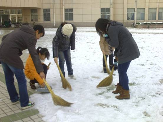为了方便师生进出教学楼,保证广大同学们的出行安全,数学与信息科学学院于12月24日下午在八号教学楼前进行了一场积雪大扫除活动。参加本次活动的是数学与应用数学一班的全体学生。