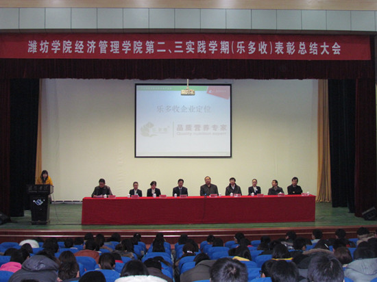 不经一番彻骨寒,怎知梅花扑鼻香。2013年1月12日上午10:00,经济管理学院(乐多收)第二、三实践学期表彰总结大会在图书馆报告厅成功举行。出席这次表彰大会的领导有潍坊学院党委委员、副院长冯滨鲁,教务处处长澹凡忠,经济管理学院院长张德升、副院长高延鹏、刘鹏,党总支书记姚秀琦,乐多收集团副总经理刘沙沙等,经济管理学院各辅导员老师和市场营销专业09、10级的同学们也参加了此次表彰总结大会。