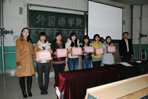 为了提高同学们的良好卫生意识,给同学们树立良好的榜样,3月14日下午,外国语学院在3#237教室举行了“文明宿舍·先进个人表彰大会”。外国语学院辅导员老师和2012、2011、2010级全体班长、团支书、舍长及部分学生会参加了此次颁奖。