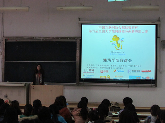 3月8号下午四时,由经济管理学院副院长高延鹏,辅导员副主任徐会全老师主持,中国互联网协会组委会副主任刘芳主讲的中国互联网协会邮政银行杯暨第六届全国大学生网络商务创新应用大赛,在致远楼6#114教室举行了启动仪式。