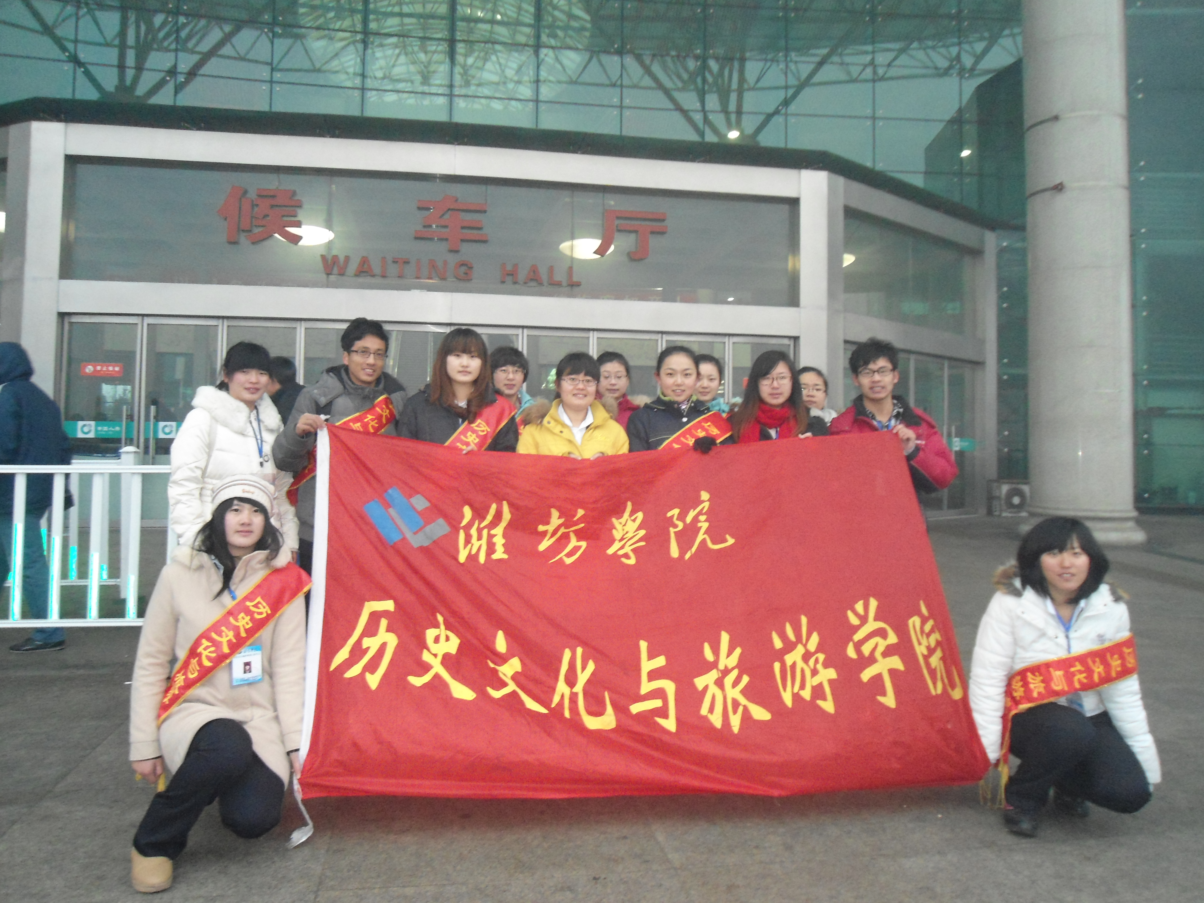 在春节这样一个传统而又重要的节日期间,潍坊学院历史文化与旅游学院的大学生利用寒假,于2013年1月15日——2月1日,2月15日——2月28日期间,组成“情暖寒冬,爱传火车站”寒假社会实践服务队,在潍坊市火车站对旅客进行帮助和服务。