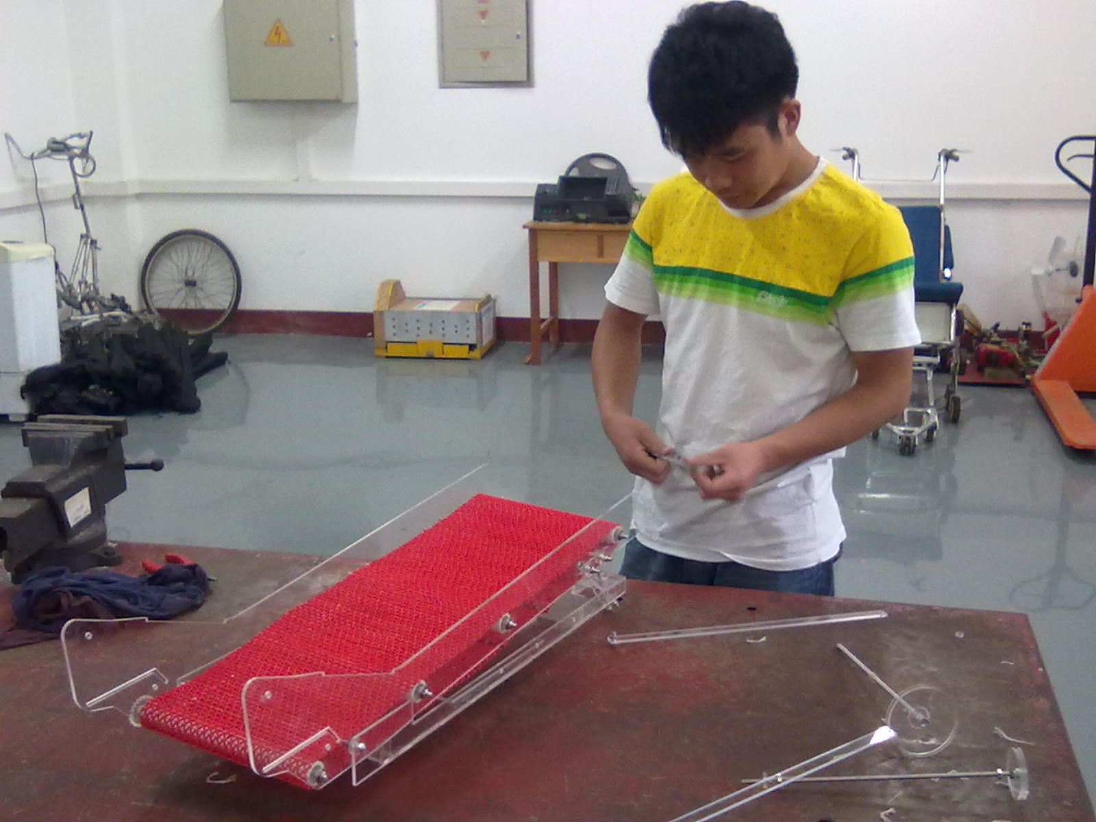 “我觉得我的工作虽然单调,却不枯燥”,当问到制作过程中的感受时,张忍忍如是说。每天的实验室生活在他的眼里是幸福的,喜欢创造过程中的挑战,面对无数次的否定于失败,他从不气馁。安装传送带时遇到了麻烦,他反反复复拆卸了50多次,就像爱迪生发明电灯那样不厌其烦地实验。