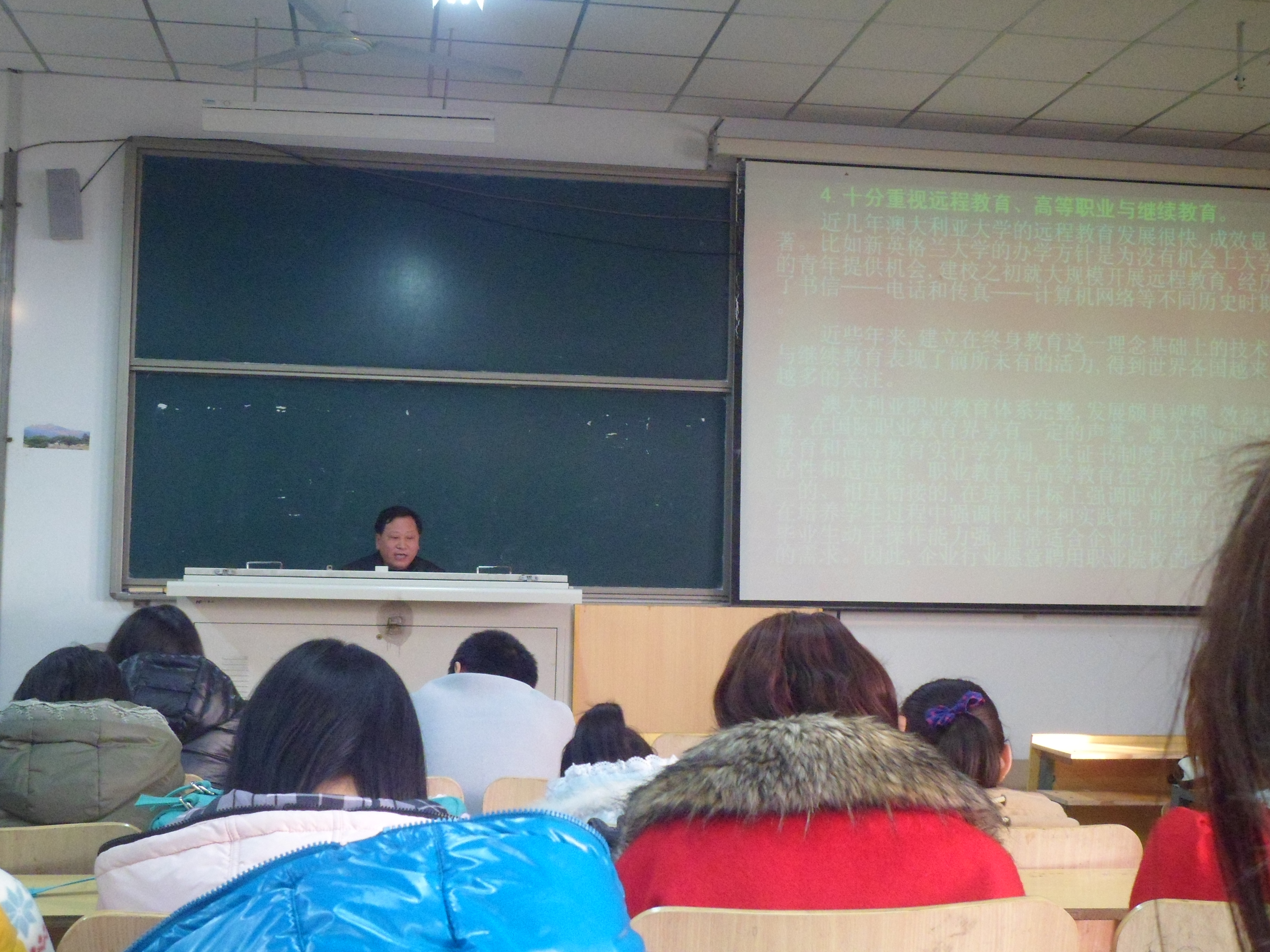 会议开始,首先,刘老师向我们展示澳大利亚、新西兰的优美风光,让我们仿佛置身其中,感受到了国外景观的独特魅力;接下来,刘老师结合自身近期在国外的生活经历,为我们讲述国外见闻,主要涉及澳大利亚的风土人情、生活习惯、规章制度等内容,让我们对这些国家有了更全面的了解;接着,刘老师对澳大利亚的几所高校施行的教育制度,办学理念进行了分析,讲述国外高校与我校的异同点,并强调我们应该相互学习,学习他们先进的办学理念,加强学生的动手实践能力,提高学生们的自主就业能力,在日益激烈的社会竞争中获得优势地位;最后,刘老师对同学们提出殷切的希望,希望与同学们能多了解一下西方国家,丰富自己的知识,开阔眼界,做对社会有用之才。