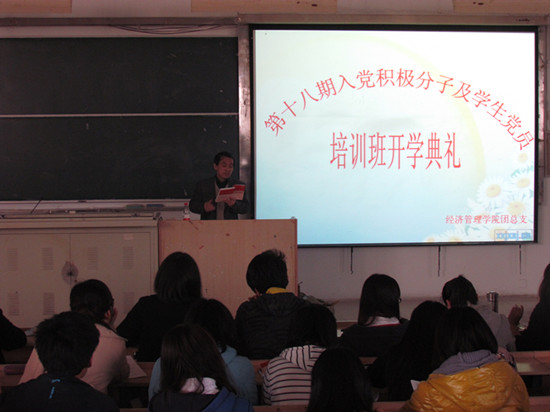 4月11日下午,经济管理学院第十八期入党积极分子及学生党员培训班开学典礼在致远楼6214教室举行,党总支书记姚秀琦,辅导员办公室主任、团总支书记任秀洁、辅导员办公室副主任徐会全出席本次典礼。