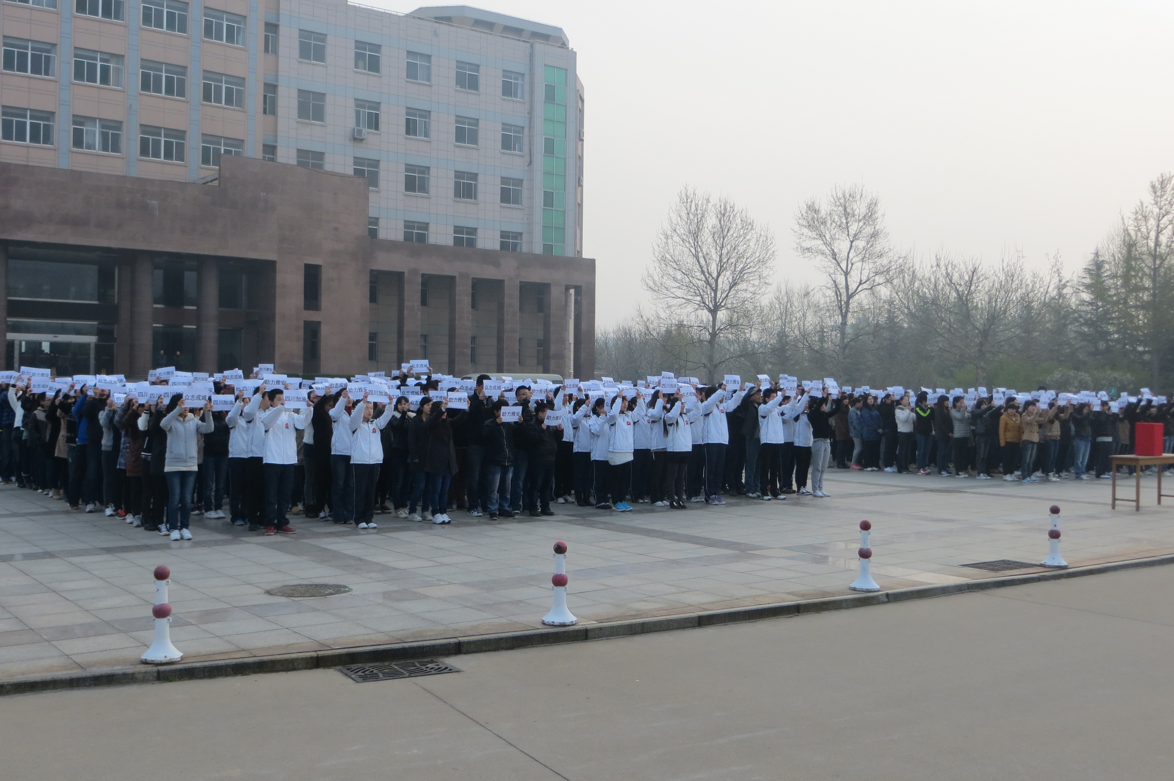 全体与会人员身着素衣、心情沉重,首先进行了三分钟的默哀仪式以寄托哀思,共同祈愿生者坚强,逝者安息。随后,教师教育学院的学生们积极响应号召,奉献爱心,为抗震救灾贡献自己的一份力量。升旗仪式过程中,全院师生现场进行了献爱心活动,师生们主动、有序地奉献了自己的爱心。献爱心活动结束后,同学们一齐举起手中的祝福标语,高声祝愿“芦山坚强,助力雅安”,升旗仪式圆满结束。随后,山东教育电视台记者对参加本次升旗仪式的师生们进行了采访,受访者表示,为灾区同胞贡献自己的一份力量是自己应尽的义务,是一件十分光荣的事,面对灾难,我们与雅安同在!