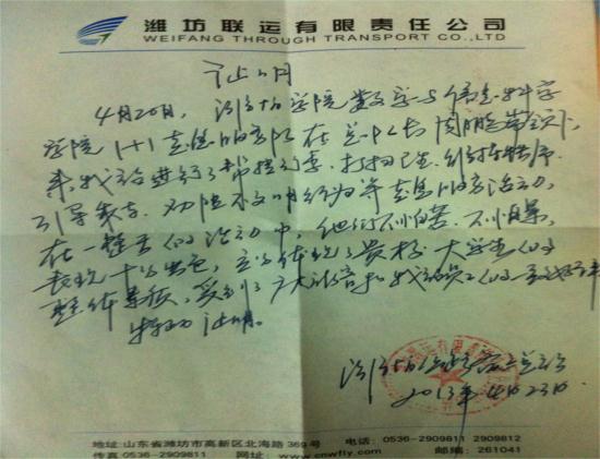 4月23日,数学与信息科学学院“1+1志愿服务队”收到了来自潍坊客运总站的感谢信。在信中,客运总站的代表人主要说出了“1+1志愿服务队”4月20日在客运总站的服务项目以及向志愿服务队表达的感谢。这些项目包括帮提行李、打扫卫生、维持秩序、引导乘车、劝阻不文明行为等。
