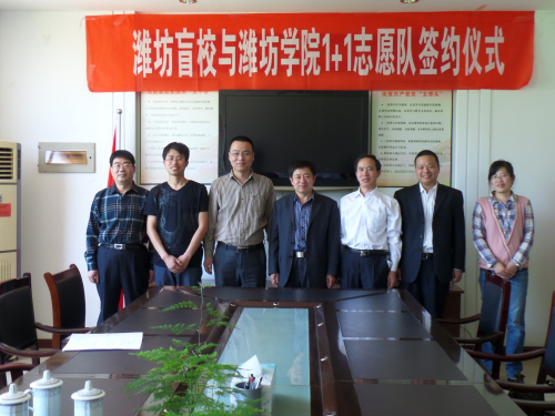 5月11日上午7:30,潍坊学院数学与信息科学学院1+1志愿服务队的志愿者们像往常一样,早早的集合准备去盲校教学。按照原计划,今天盲校将要和1+1志愿服务队正式签约。