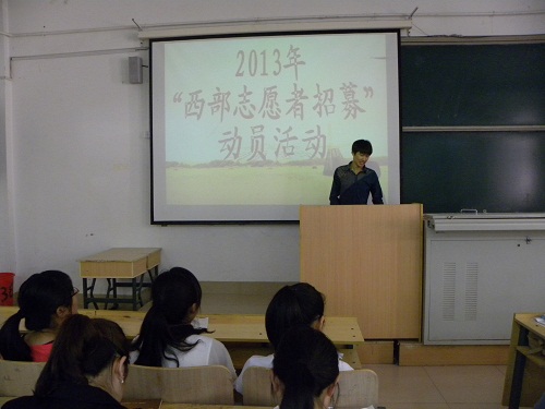 5月21日上午9点,数学与信息科学学院在8#123举办了“2013年西部志愿者招募”动员活动。数学学院学生王伟军担任此次活动的嘉宾,参加本次活动的有数学学院各年级的学生代表。