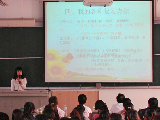 炎热的天气阻挡不了同学们学习的热情,偌大的教室也坐满了前来“取经”的同学们,学姐们大方的将自己在备考过程中积累的经验和亲身感受与在场同学分享交流,帮助同学在日后的复习准备中少走弯路。交流的内容大致可以分为政策介绍、考试流程、复习方法和经验介绍四个方面,她们一致认为要有一个明确的目标才会有一个为之努力的方向,强调了一个良好的心态在备考过程中的重要性,良好的团队意识也是取得成功不可或缺的重要条件之一。在学习上要注重平时的积累,不断地练习巩固,多做真题,善于总结,天道酬勤。针对面试部分,学姐们指出面试是对人综合能力的考察,因此要敢于去表达,自我介绍要有亮点,要与应聘职位相吻合,只有做好充分的准备工作才能在千千万万的竞争者中脱颖而出。最后姚书记上台进行最后的总结发言,他希望同学们要有学习的精神,能够静下心来认真学习,要把学姐们的经验当成一笔宝贵的财富,不断学习,不断进步。