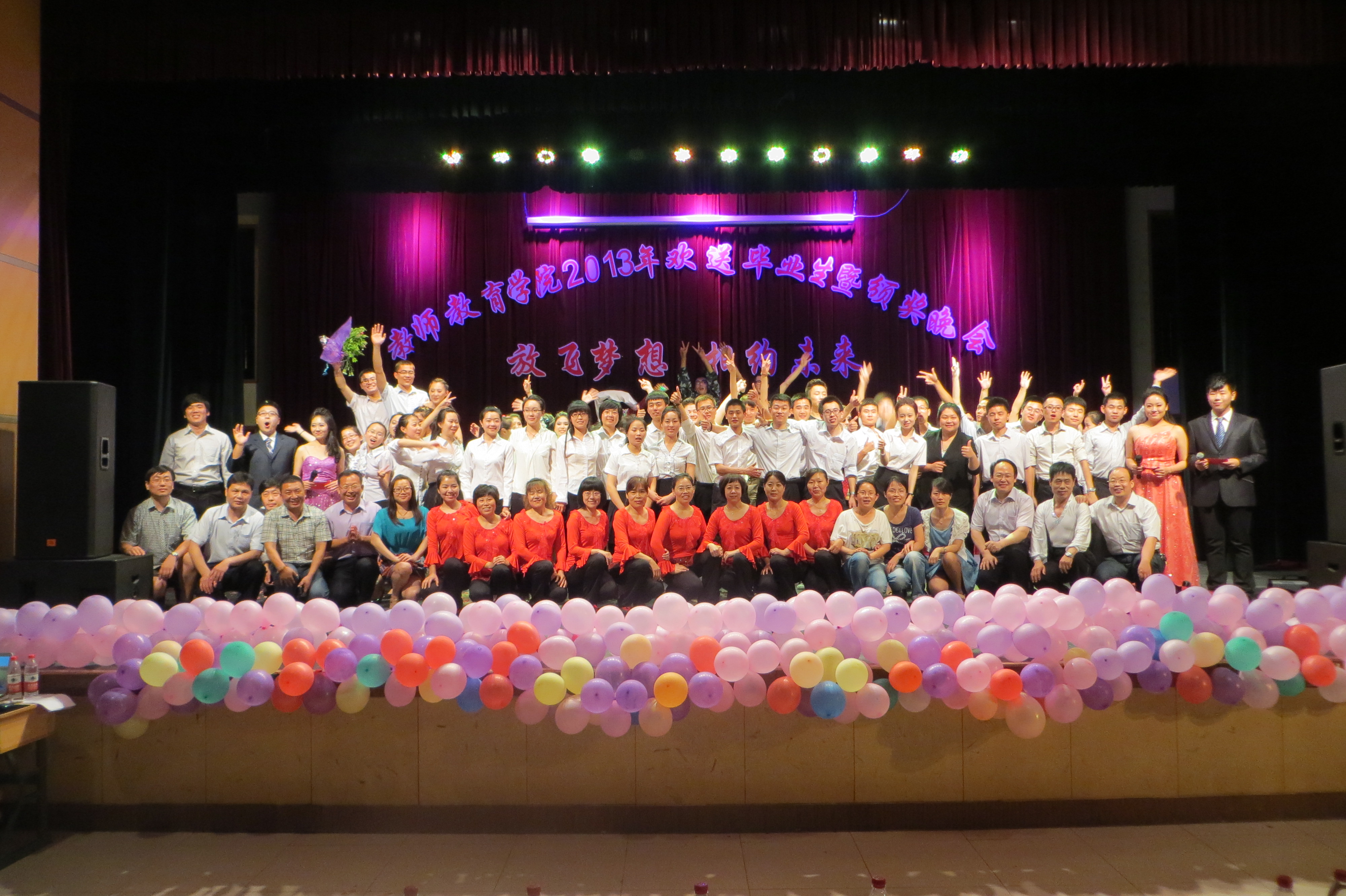 为表达广大师生对毕业生的美好祝愿,让毕业生们感受到潍院大家庭的温暖,唤起同学们四年大学生活的美好回忆,6月8日晚,教师教育学院于闻韶楼举办了以“放飞梦想,相约未来”为主题的欢送毕业生晚会暨颁奖典礼。晚会由教师教育学院主办,教师教育学院团总支、学生会承办,莅临本次晚会的嘉宾有教师教育学院党总支书记、院长曲振国,党总支副书记郭建伟,副院长李健,副院长魏晨明以及各位老师。同时兄弟院系以及教师教育学院2009级至2012级部分同学参加了此次活动。