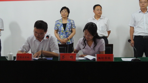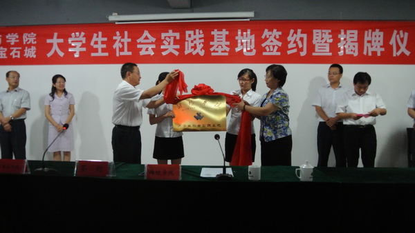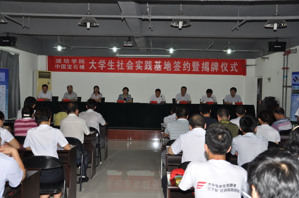2013年7月24日,潍坊学院大学生社会实践基地签约暨揭牌仪式在中国宝石城昌乐县管委会举行。昌乐县副县长崔全华,我校党委委员、纪委书记马茜华为社会实践基地揭牌并作重要讲话,宝石城管委会副书记、副主任刘文涛和我校团委书记周莹共同签约,昌乐县副县长李诚顺、团县委副书记田勇、我校团委副书记徐加金、昌乐县管委会全体职工和优秀企业代表,我校弘德湖青春圆梦志愿服务队全体成员参加揭牌仪式。会议由昌乐县开发区管委会书记张金涛主持。 本次社会实践基地签约暨揭牌仪式是由潍坊学院和昌乐县委双方友好协商、共同建立的,旨在加强校企交流,促进企业发展,帮助大学生就业。这一平台的建立,使学生在亲身实践中体察社会,丰富见识,增长才干,为将来走上社会奠定坚实基础。昌乐县委、县政府将大力支持大学生社会实践基地的建设,为双方合作创造良好条件。县经济开发区和宝石城管委会将做好相关工作,提供周到服务,为社会实践营造良好环境,保证实践效果。