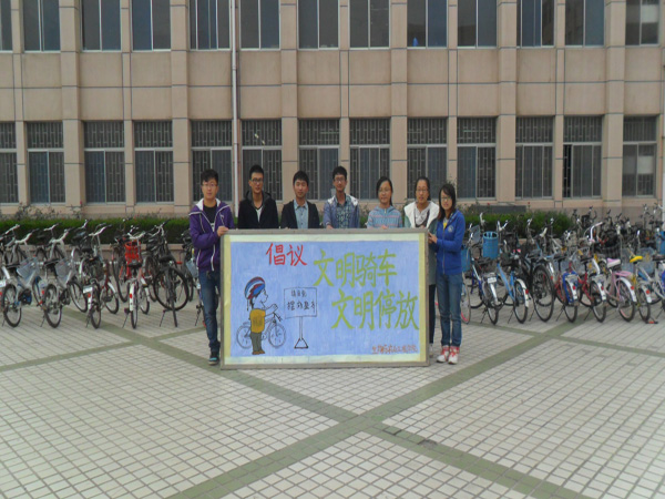 高校作为社会的重要组成部分,对于构建和谐社会影响很大。 我们美丽的潍坊学院就是一个小城市,交通文明是我们这座“城市”文明的标志。今年由于校园的扩建,我校学生自行车数量剧增,部分同学不注意自行车的规范停放,导致教学区、宿舍区等多地交通堵塞,严重影响了同学们的日常学习生活,破坏了优美、整洁的校园环境。为美化校园环境,维持良好的校园秩序,创建良好校园交通环境,生物与农业工程学院学生会代表用行动给全校同学们做出倡议。倡议内容包括:一、 自觉将自行车停放到指定区域,不占用道路。自觉地将自行车摆放到道路两旁的地砖带上;二、 摆放整齐紧凑,保持场地清洁。按顺利一辆接着一辆,车头与车尾统一方向整齐摆放。三、 服从保安、宿舍管理员及其他相关工作人员指挥,不在宿舍门口乱停乱放,宁可多走几步,也不贪图一时方便。四、 从自己做起,做到文明停车,并爱护他人车辆。见到有不规范停放的车辆,大家主动将车移向道路两旁的地砖停车带,为大家出入方便提供一条通畅的大道。五、 同学之间互相监督,及时提醒其他同学将车停放在合适位置。