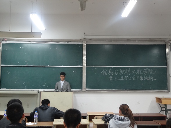 2013年10月31日晚7:00,信息与控制工程学院在致远楼6203举行第十三届学生会干事竞选。参加竞选的为2013级新生,信息与控制工程学院各部部长作为评委出席了此次竞选活动。
