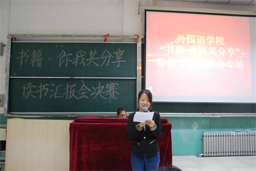 为了使外国语学院学生养成良好的读书习惯,继承外国语学院书籍共分享的优良传统,为同学们提供展示自我、分享心得的平台,外国语学院于10月10日在3#237教室举行了主题为“书籍•你我共分享”读书报告ppt汇报会。此次汇报会由外国语学院辅导员办公室主任姜廉毅、辅导员王锋、外国语学生会主席闫甜甜和团总支副书记刘聪担任评委,外国语学院学生会成员及2012级全体学生参加了此次汇报会。