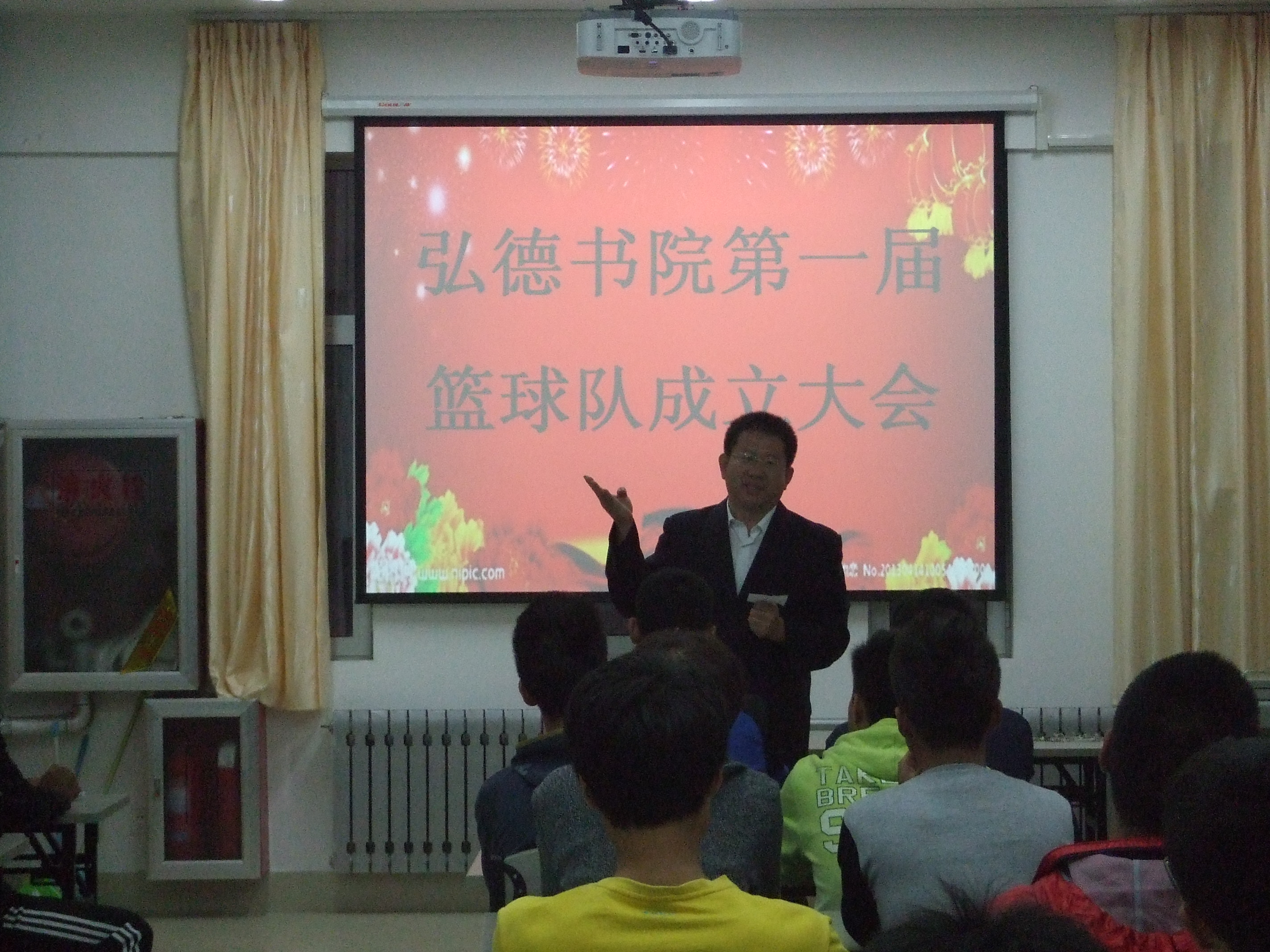 2013年10月14日下午,在陈子夫院长与卢永波老师的组织下,弘德书院第一届篮球队成立大会顺利召开。大会确定了“以球会友,相互了解”的基本原则,目的是为了活跃学校体育氛围,激发学生参与体育活动的积极性,全面发展学生的身体素质,提高运动能力,增强同学们团结合作和顽强拼搏的精神。