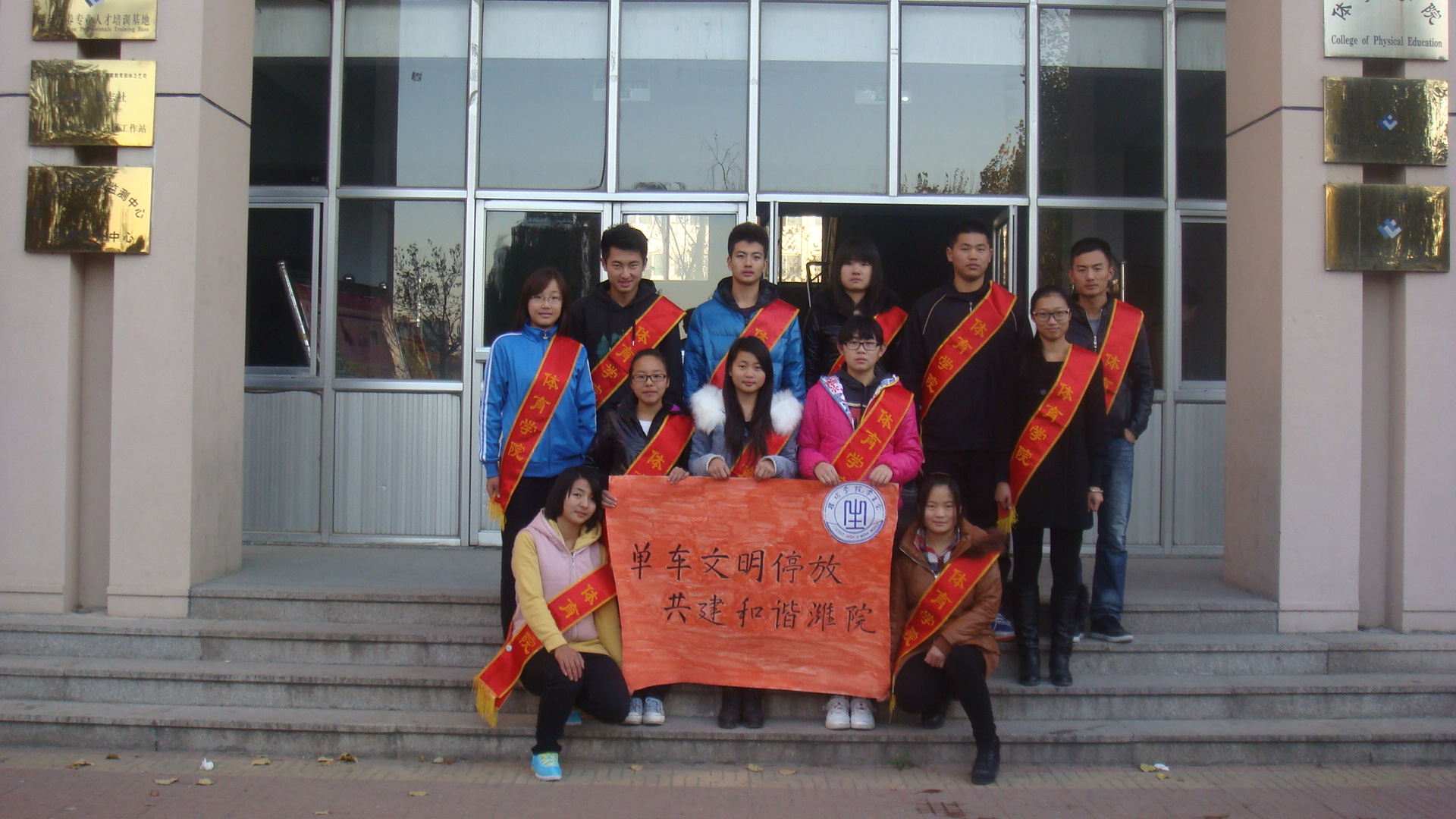 11月18日,在体育学院教学楼前,“单车文明停放、共建和谐潍院”活动正在如火如荼的展开,体育学院的志愿者积极加入此次活动。