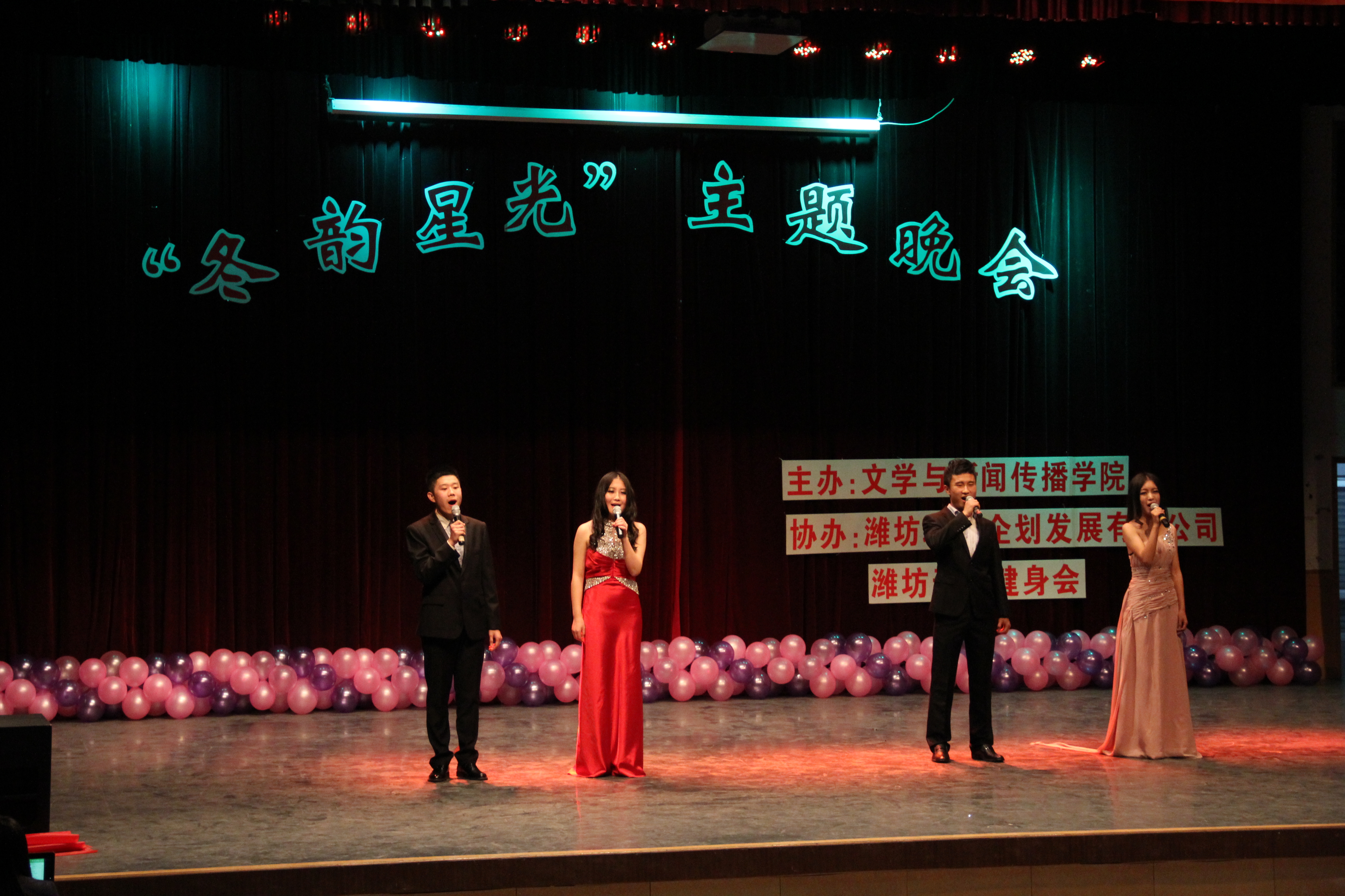 潍坊学院文学与新闻传播学院为响应18届三中全会精神,坚定践行群众路线,逐步实现“中国梦”的伟大构想,藉此契机举办了一系列以“中国梦”为主题的活动,11月18日晚7点,在闻韶楼排练厅举办了“冬韵星光”主题晚会,文学与新闻传播学院党总支书记郭顺敏,团总支书记、辅导员办公室主任郭荣波,各辅导员老师等领导及嘉宾出席本次晚会,文学院学生观看了本次晚会。
