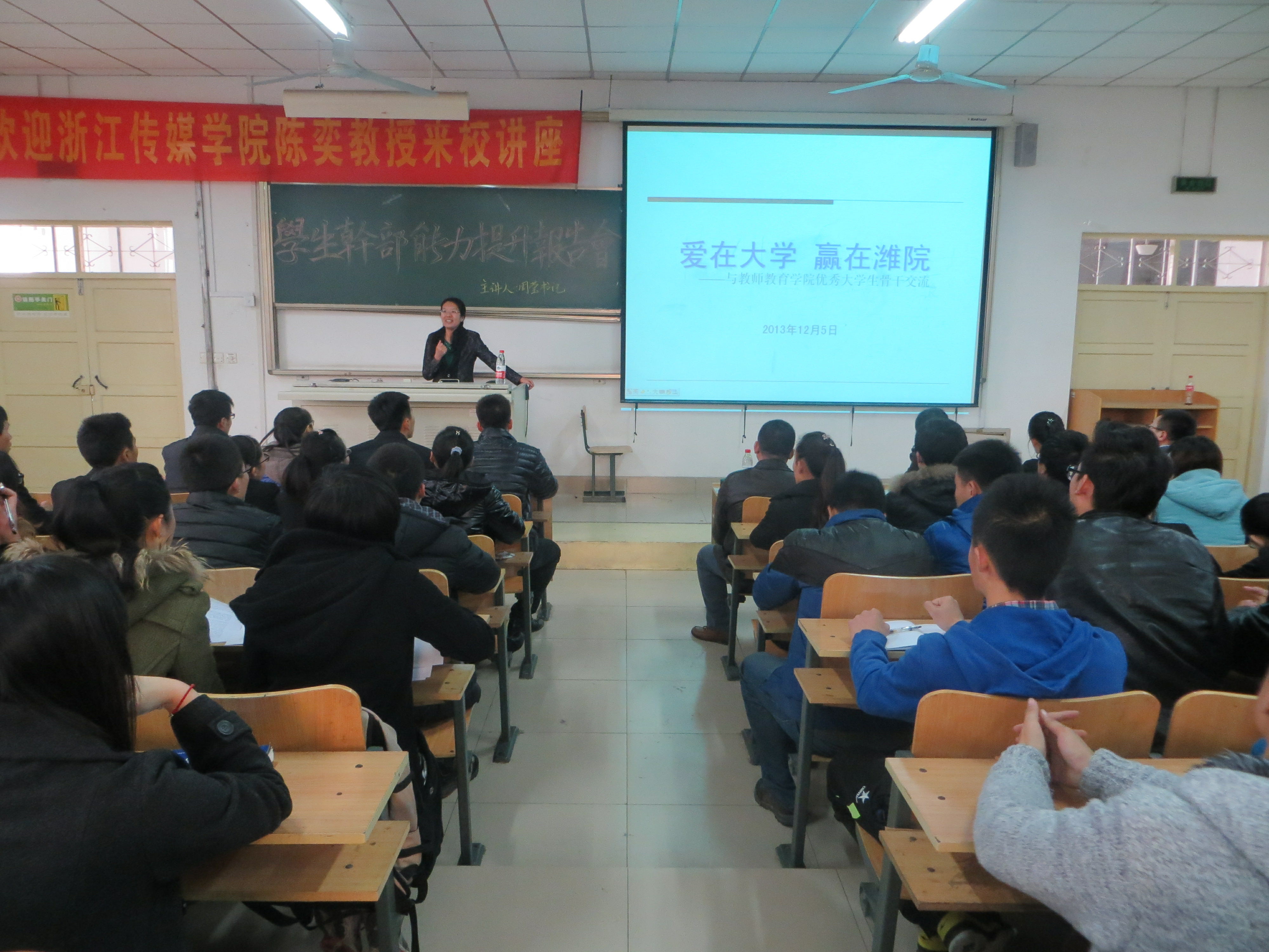 为进一步提高学生干部办事能力,增强服务意识。12月5日下午2点,教师教育学院于天一楼7306教室召开了以“爱在大学,赢在潍院”为主题的学生干部能力提升报告会。本次报告会的主讲人是潍坊学院周莹书记,教师教育学院全体学生会干部参加了本次报告会。