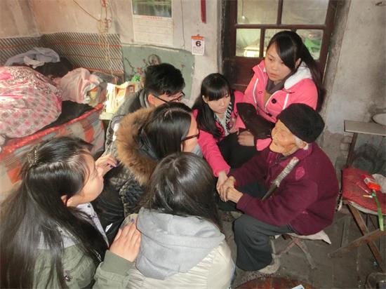 12月7日,美术学院“七色花”志愿者服务队新注册志愿者们来到高新区王谭村,看望了孤寡老人杨桂兰。
