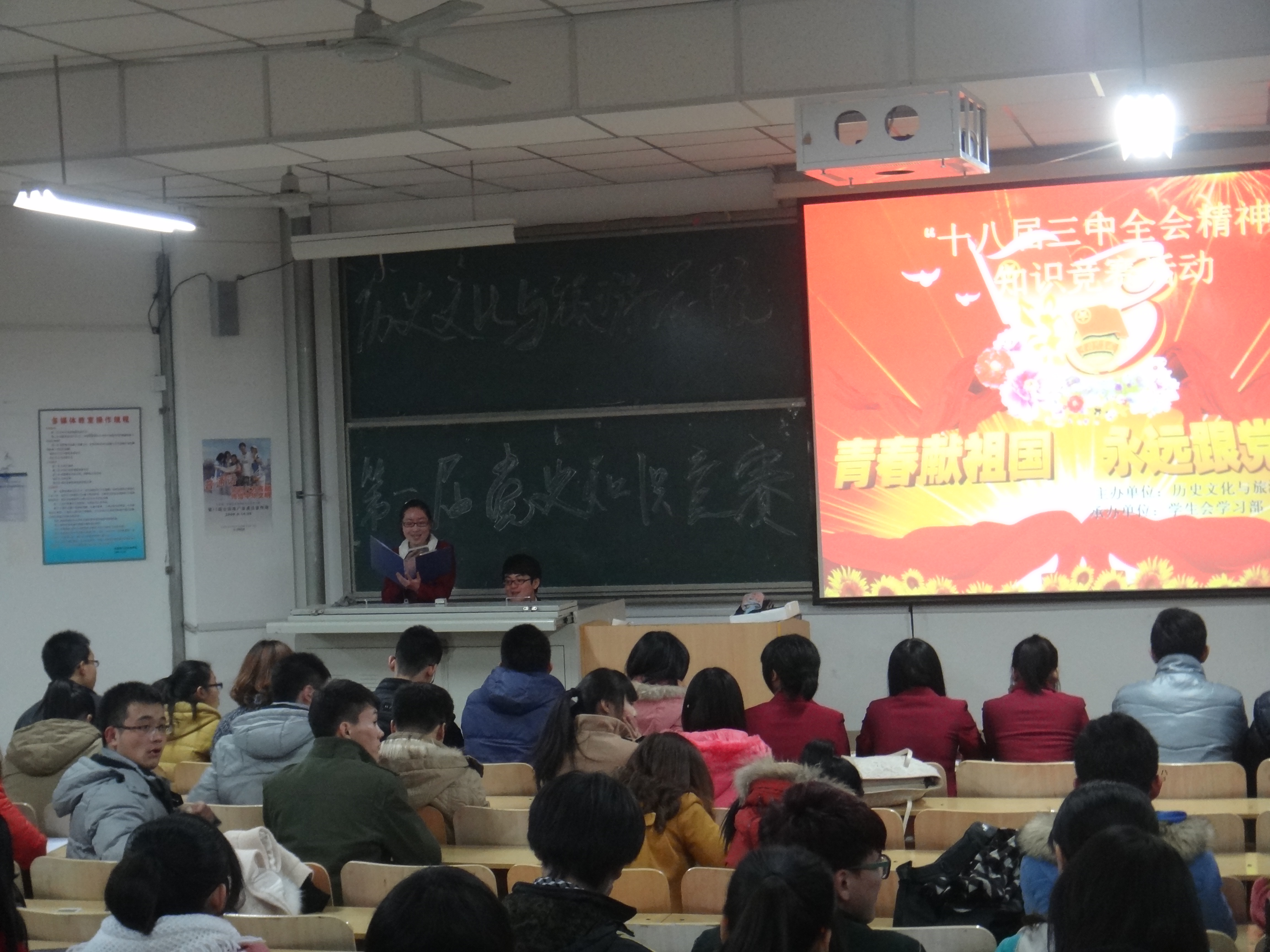 12月16日晚7:00,由历史文化与旅游学院团委主办,历史系学生会学习部承办的“十八届三中全会精神”知识竞赛活动在8421教室开展,参与此次活动的有2012级学生会成员代表及按班级分为5个比赛小组的全体大一新生。