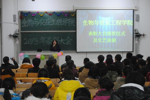 2013年12月18日晚7:00,生物与农业工程学院在8514教室隆重举行了2013年优秀学生表彰大会颁奖仪式及文艺表演活动。出席本次大会的领导有生物与农业工程学院院长曹慧,副院长张保仁,辅导员办公室主任马俊玲以及各年级辅导员老师们。获奖同学代表及2013届学生会全体成员都参加了本次大会。