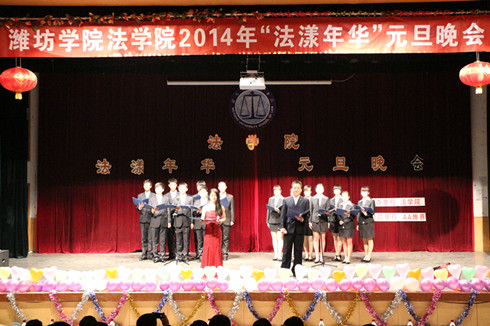 为迎接马年元旦,共庆新春,展现多才多艺的法学院,12月19日晚,以“法漾年华”为主题的法学院2014年元旦晚会在潍坊学院闻韶楼报告厅隆重举行,法学院书记陈子文,院长苗金春,副院长李大欣、赵宝华以及各位老师应邀出席了此次晚会。