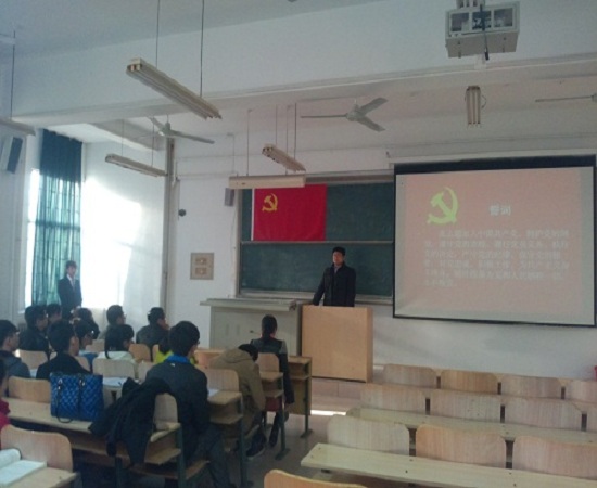 大会开始,由新一批党员发展对象牟雪丹等3名同学就入党动机、本人的思想状况向支部作出汇报。申请入党的同学都真情的表达了对党的向往,对党的忠诚,表示坚定不移跟党走,为党的工作付出自己的力量,为共产主义事业奋斗终生。接着入党介绍人王振国介绍三位同学的情况,毛瑞涛、史善杰、李泉对发展党员寄予希望,希望他们随时与党中央保持一致,为同学服务,做学生表率,加强自我要求。大会进行第二项由辅导员王振国老师、尚超老师对刘凯等11位同学的转正问题发言。拥有表决权的党员对接收党员与预备党员进行了举手表决,最终通过了转正党员转为正式党员,发展对象正式成为预备党员。学生党支部书记王慧宣读支委会意见,全体党员起立宣誓,他们高亢激昂,声音久久回荡在教室里,真正展现出了对党的崇高敬意。最后由信控学院党总支杨书记讲话,并给本批发展党员讲解入党志愿书的填写要求,注意事项。至此,大会圆满落幕。