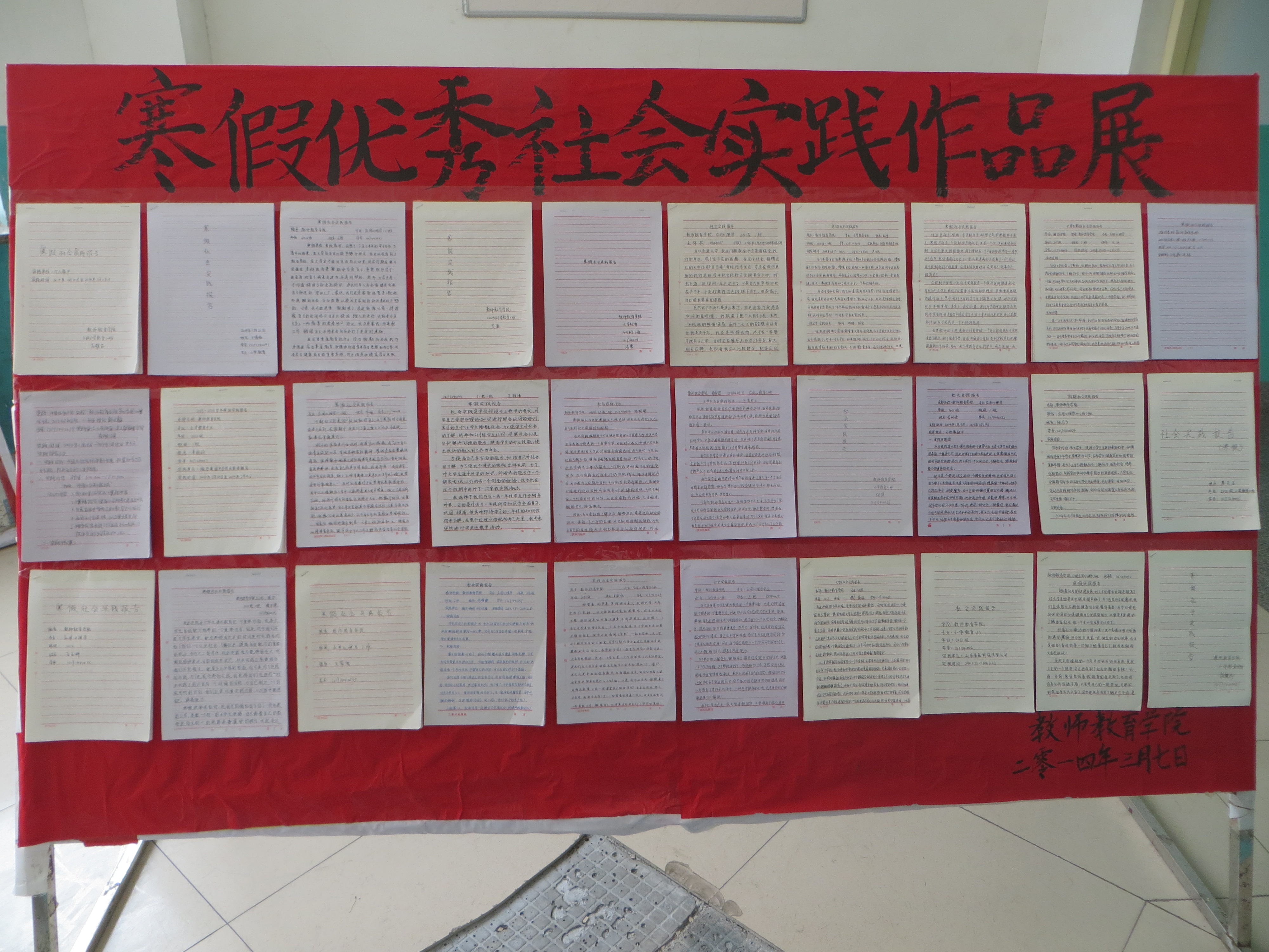 为使同学们全面了解社会,深入基层,教师教育学院在寒假期间组织学生参加不同行业领域的社会实践活动。自3月10日开始,学院从2012级和2013级的社会实践报告中选拔出三十份优秀作品并进行刊板展示,以鼓励同学们在假期期间锻炼自己各方面的能力,把从书本中学到的知识灵活的运用到实践中去。