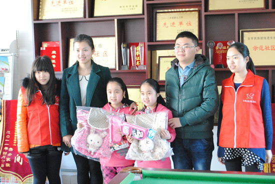 2014年3月17日上午,白鸽志愿服务中心主任李志辉、部长王晓涵带领“校园之星”吕彪和志愿者们一起进社区,用爱心拍卖所得的善款为孩子们送去礼物。