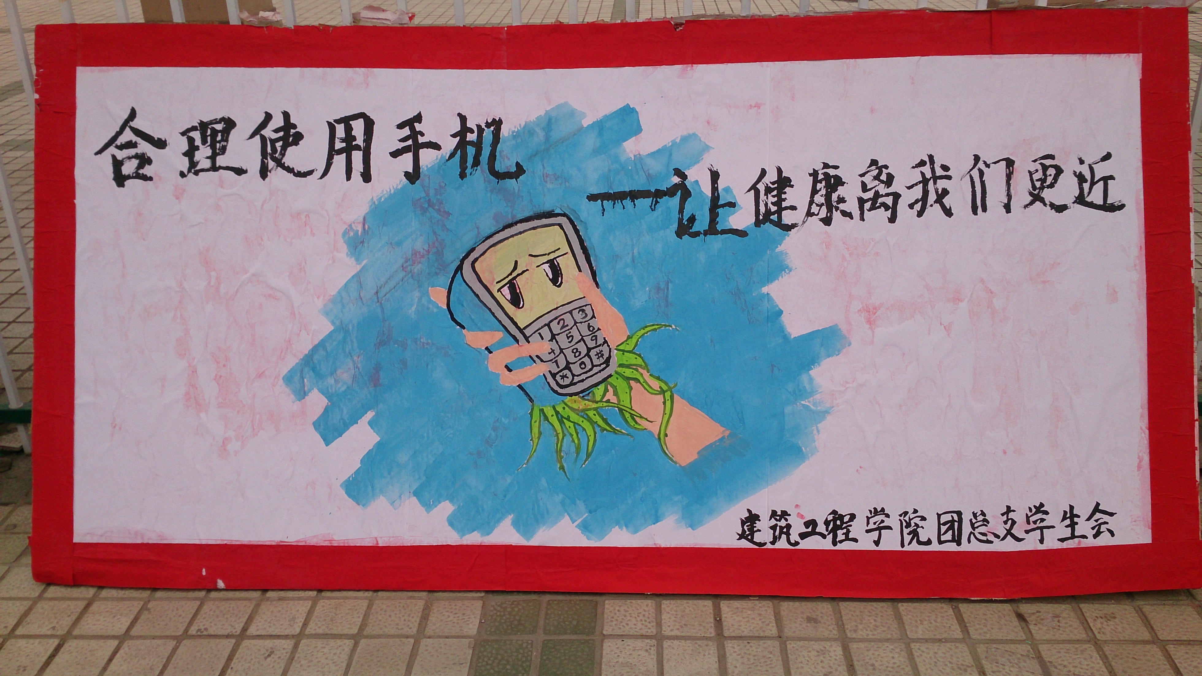 为了更科学、全面地了解大学生使用手机情况,建筑工程学院网络信息部和外联部决定在班里随意抽取20名同学做一次网上问卷调查。问卷从各个方面了解大学生使用手机的情况,例如使用手机的时间、频率、功能,更重要的是了解到大学生身边在没有手机的情况下会不会感到焦虑。建筑工程学院网络信息部和外联部的同学们还针对调查结果展开理性分析,引导大学生正确使用手机并现场征集文明标语、发放活动单页和学生访谈。标语征集组在六号教学楼门口贴海报作宣传,还竖有“标贴板报”。例如“手机流量决定上课质量。请勿在课堂上使用手机”、“人人网:对不起,您登陆的账号正在上课,请稍后再登”等既有意义又朗朗上口的宣传语。
