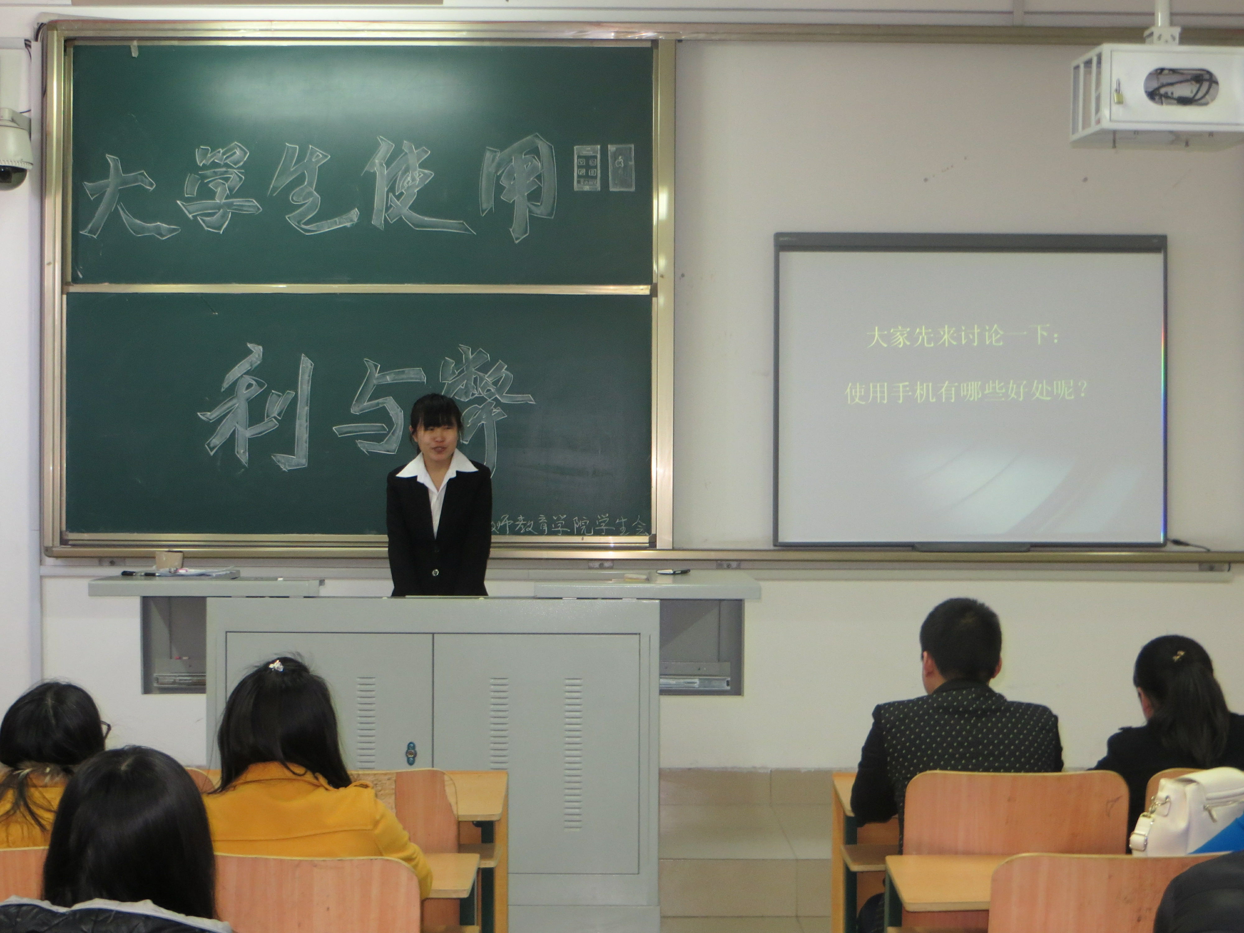 本次讨论会主要分三个方面进行讨论,讨论会伊始,主持人将同学们分成若干小组,进行分组讨论。首先,主持人通过一系列的图片展示了现代手机的多样化,同时提出本次讨论的第一个主题——使用手机的好处。讨论过程中,同学们畅所欲言,说出了不少手机的好处:第一,手机作为一种交流工具,可以随时随地的交流沟通,增加了家人、朋友间的感情;第二,对于当代大学生而言,手机可以作为一种上课的辅助工具,及时搜集重要的学习信息;第三,手机作为一种娱乐工具,可以帮助人们在学习工作之余,缓解精神压力,提高学习工作效率。接下来,主持人利用相关案例展开了第二个讨论主题——使用手机的弊端。相比于好处,同学们对弊端讨论更加激烈。首先,手机更新换代太快,对于大学生来说,增加了经济负担。其次,不少同学上课玩手机,不仅影响自己的学习,而且打扰老师讲课,降低了学习效率。最重要的是,手机本身的辐射问题,严重影响同学们的身体健康。最后,在一段幽默的“低头族”视频中,本次讨论会圆满结束。