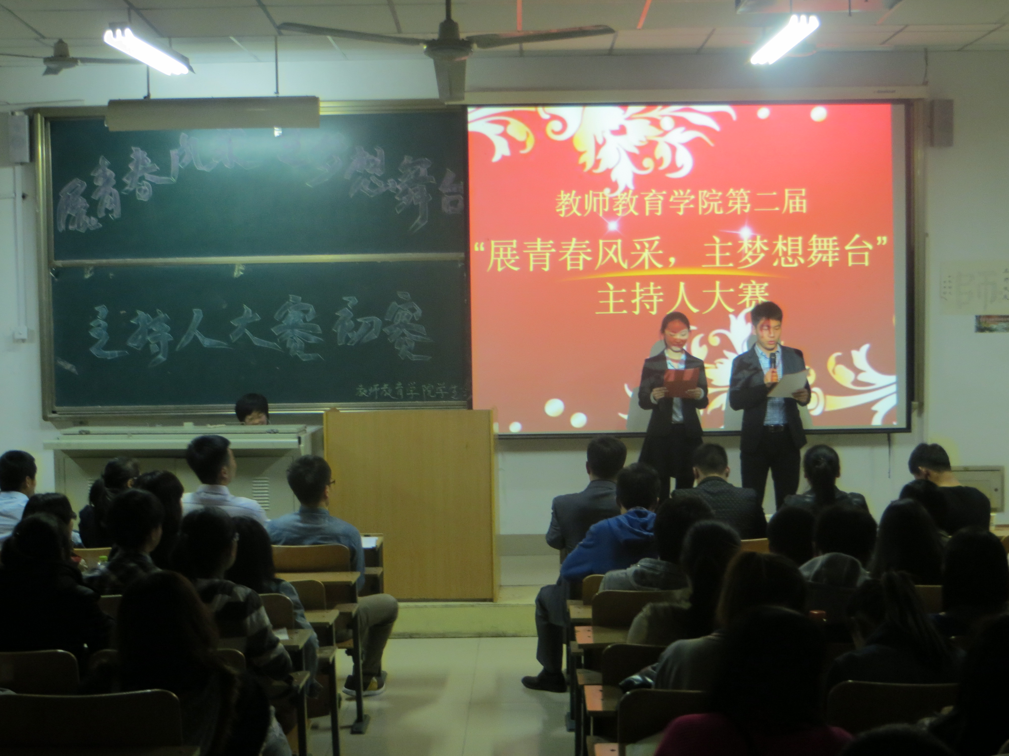 为丰富当代大学生校园生活,展现当代大学生风采,3月30日晚7点,教师教育学院于天一楼7422教室举办第二届“展青春风采,主梦想舞台”校园主持人大赛初赛,参加此次活动的有教师教育学院及文学与新闻传播学院2013级学生。