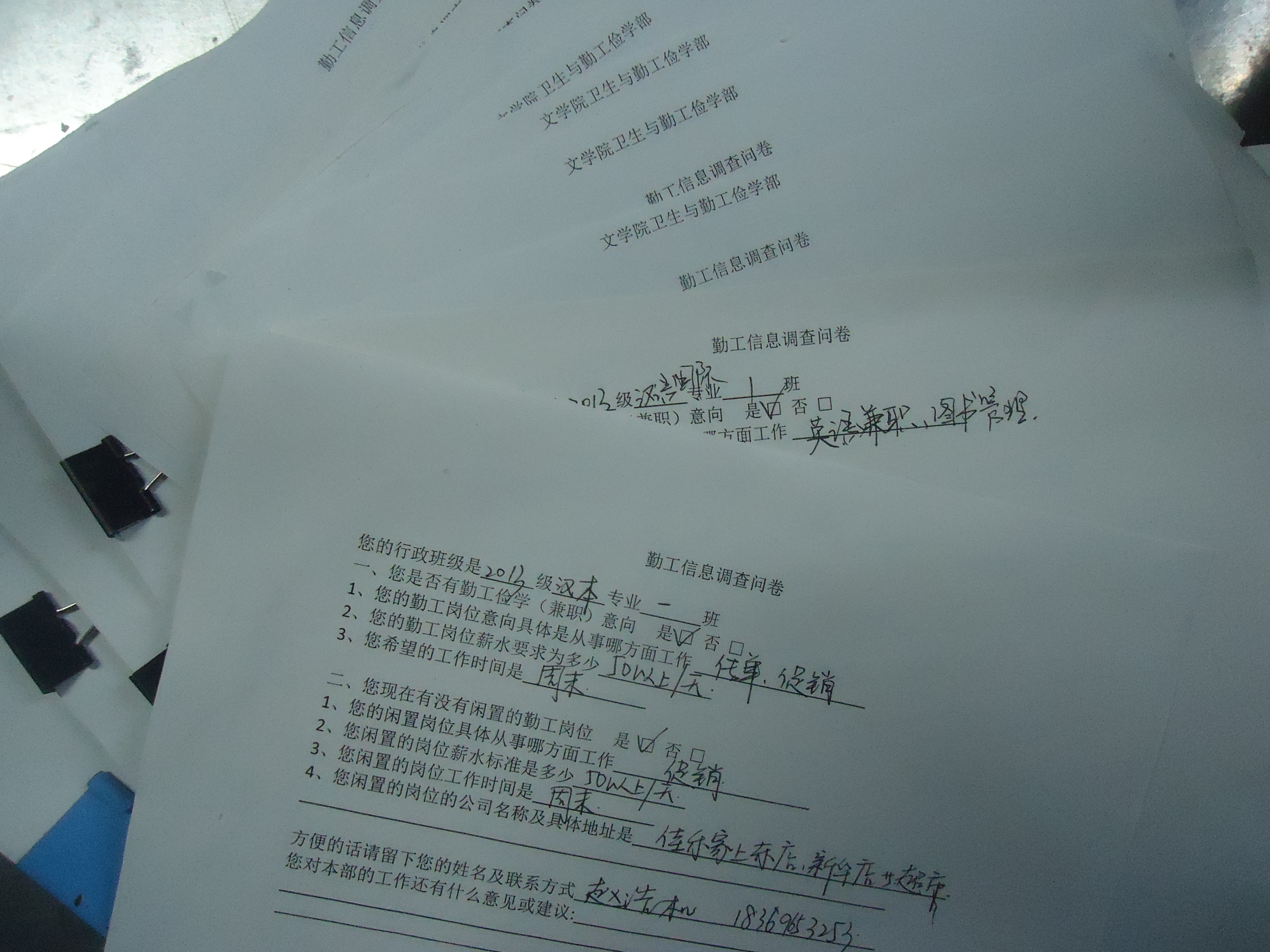 最后干事们发放《勤工俭学意向表》让学生们自由填写。同学们积极参与,认真填写,同时勤工俭学的种子在此时生根发芽,“勤风行动“招聘会也就此落下帷幕。
