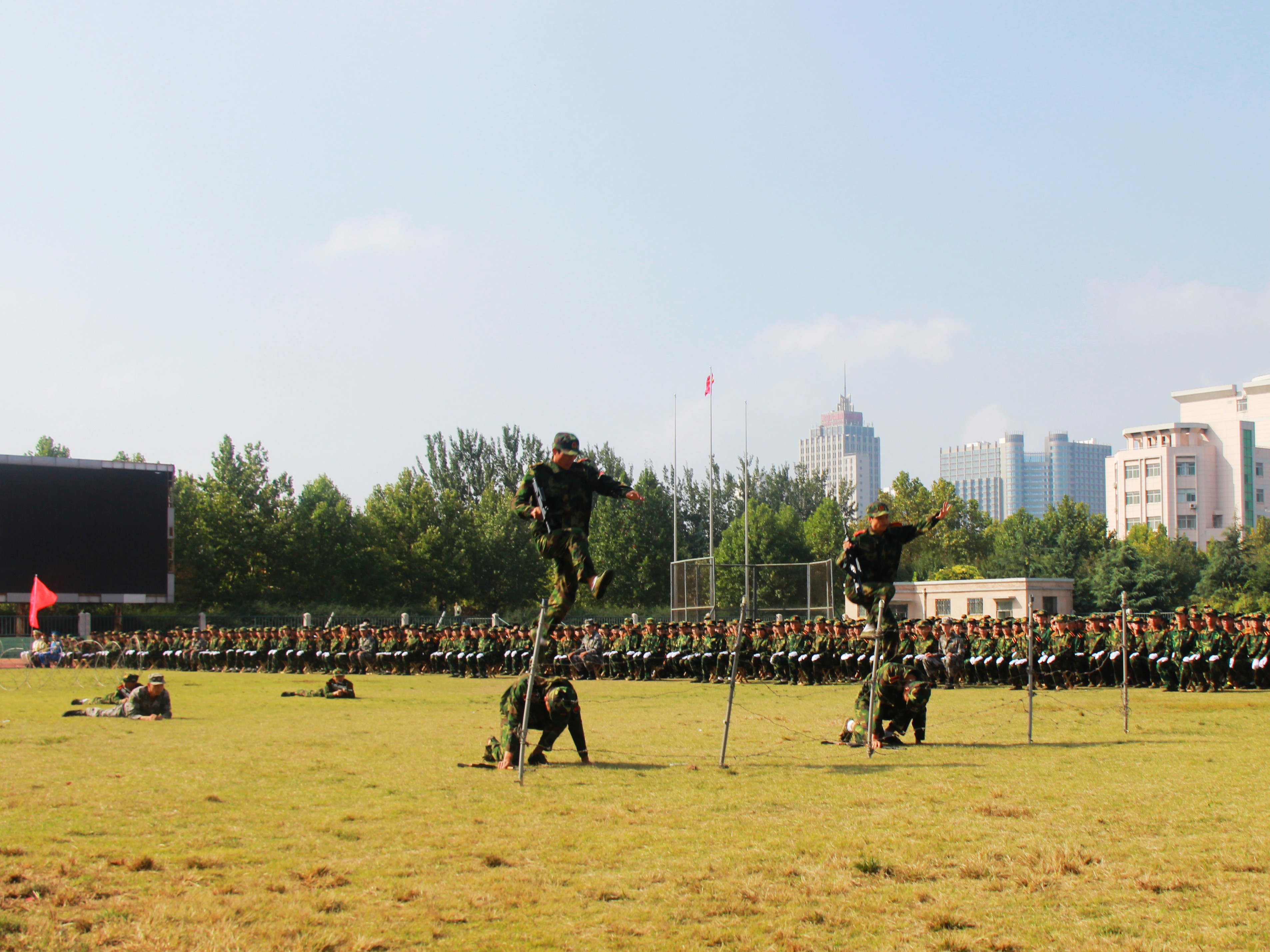 体育学院2014级新生是由220人组成的2营11连和12连两个代表方队进行汇报表演。他们迈着整齐而有力的步伐,斗志昂扬、激情向上,喊着响亮的口号向主席台走去。其中,尤为突出的是特种兵训练表演。此表演方队由体育教育专业12名同学组成,由特训教官带领他们完成跨越障碍物、持枪隐蔽等五项特种训练动作,最后帅气收场。期间更是掌声不断。内务整理表演、军体拳表演及军姿表演方队均是赢得喝彩连连。在此之前军训的日子里,天气时而阴雨时而烈日,他们从未畏惧,从未退缩,面对着突变的天气状况,有的同学生病了,但仍是凭借着顽强的意志,稍有好转便继续坚持训练,在这12天的时间里,摆收马扎、齐步走、正步走、齐步变正步、整理内务等预定训练科目已初见成效。教官手把手教,学生们认真踏实地学。最后,14级新生军训汇报表演圆满结束了。
